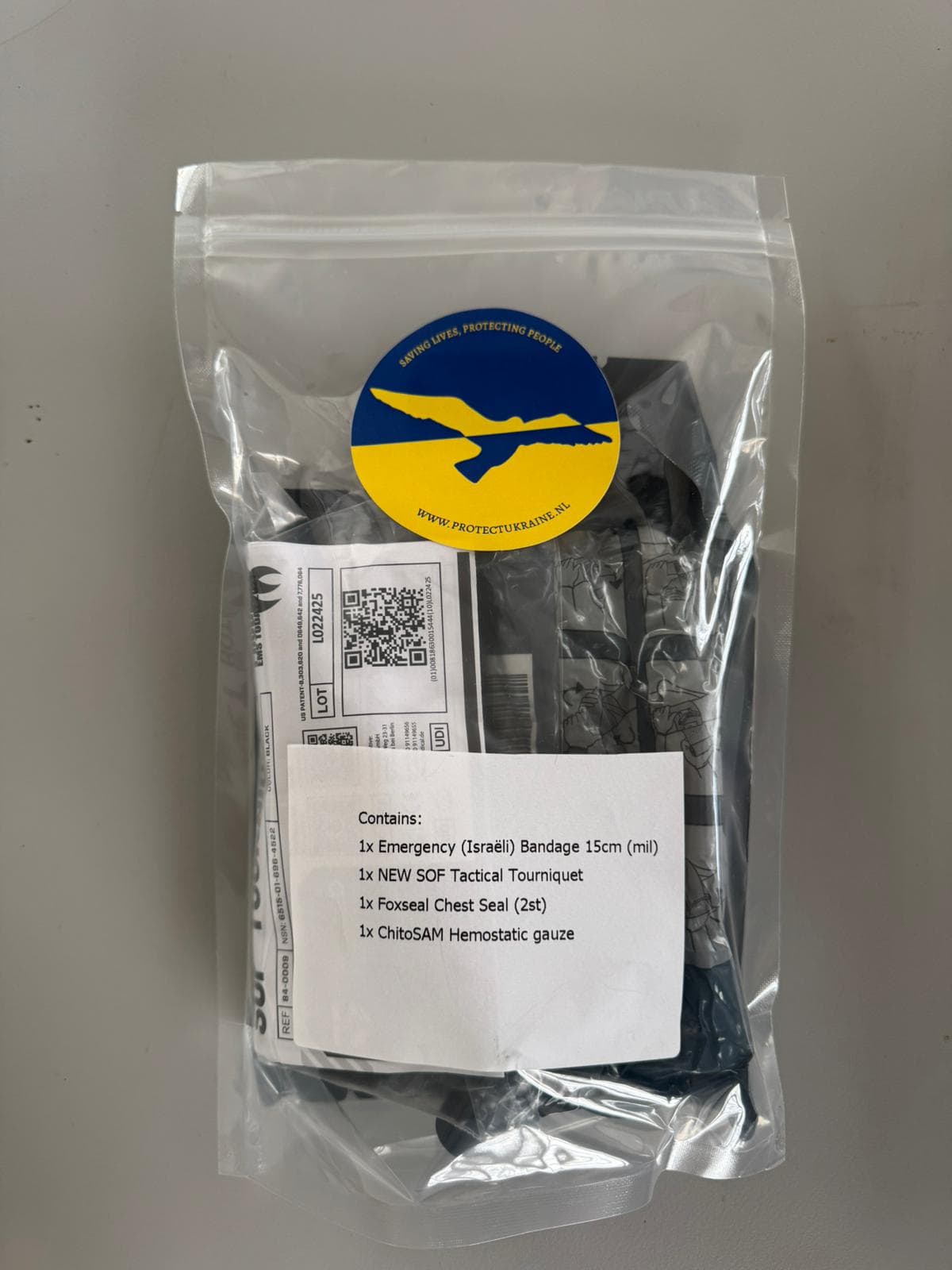 We supply trauma kits to Ukrainian forces with every convoy, including a tourniquet, chest seals, hemostatic gauze, and an emergency bandage — essential for treating severe bleeding and lung injuries. Due to shortages on the front line, each service member must carry such kits.